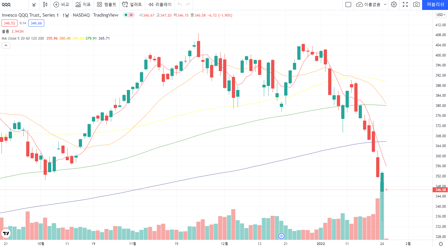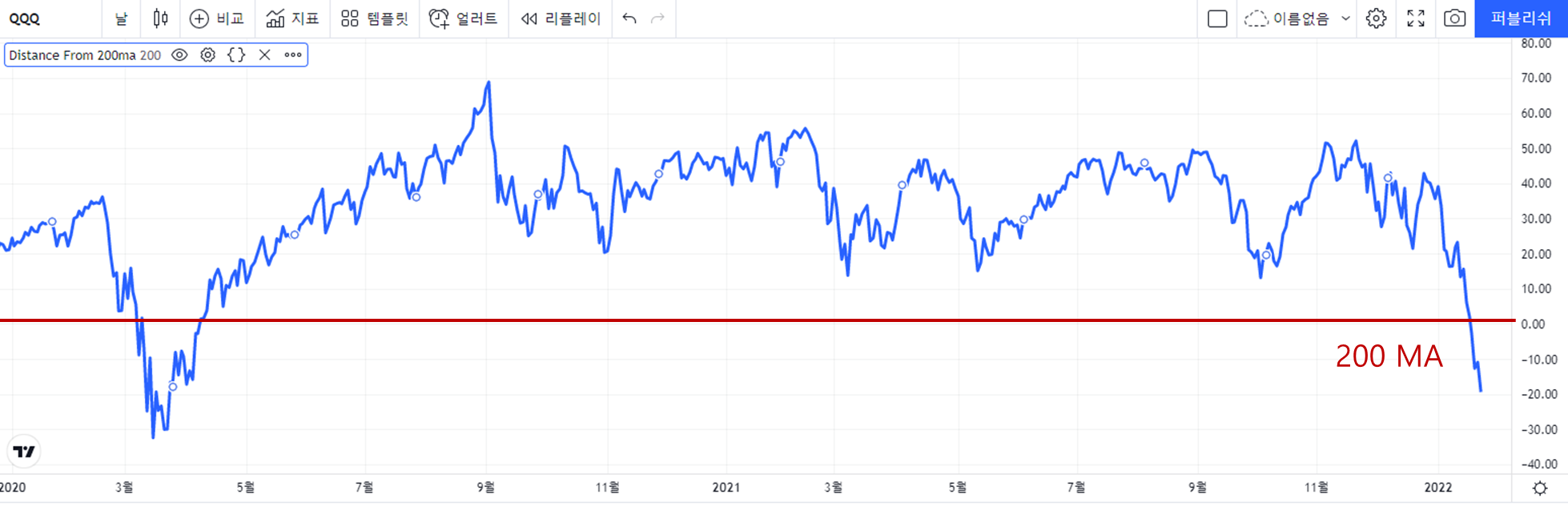 포스팅하는 2022년 1월말 현재 200일 이동평균선과 -20% 가까이 이격 된것을 볼 수 있는데 코로나 상황까진 아니나 일종의 패닉셀이 나타나는 구간으로 볼 수 있겠다.